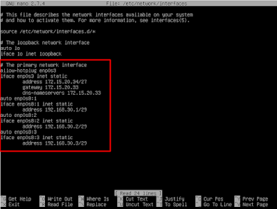 4. Kemudian kita konfigurasikan network untuk debian terlebih dahulu, tambahkan sub interface dan ip masing-masing yang akan kita gunakan untuk share hosting nanti. ketikkan perintah nano /etc/network/interfaces, jika sudah kita save dengan cara Ctrl X > Y > Enter.